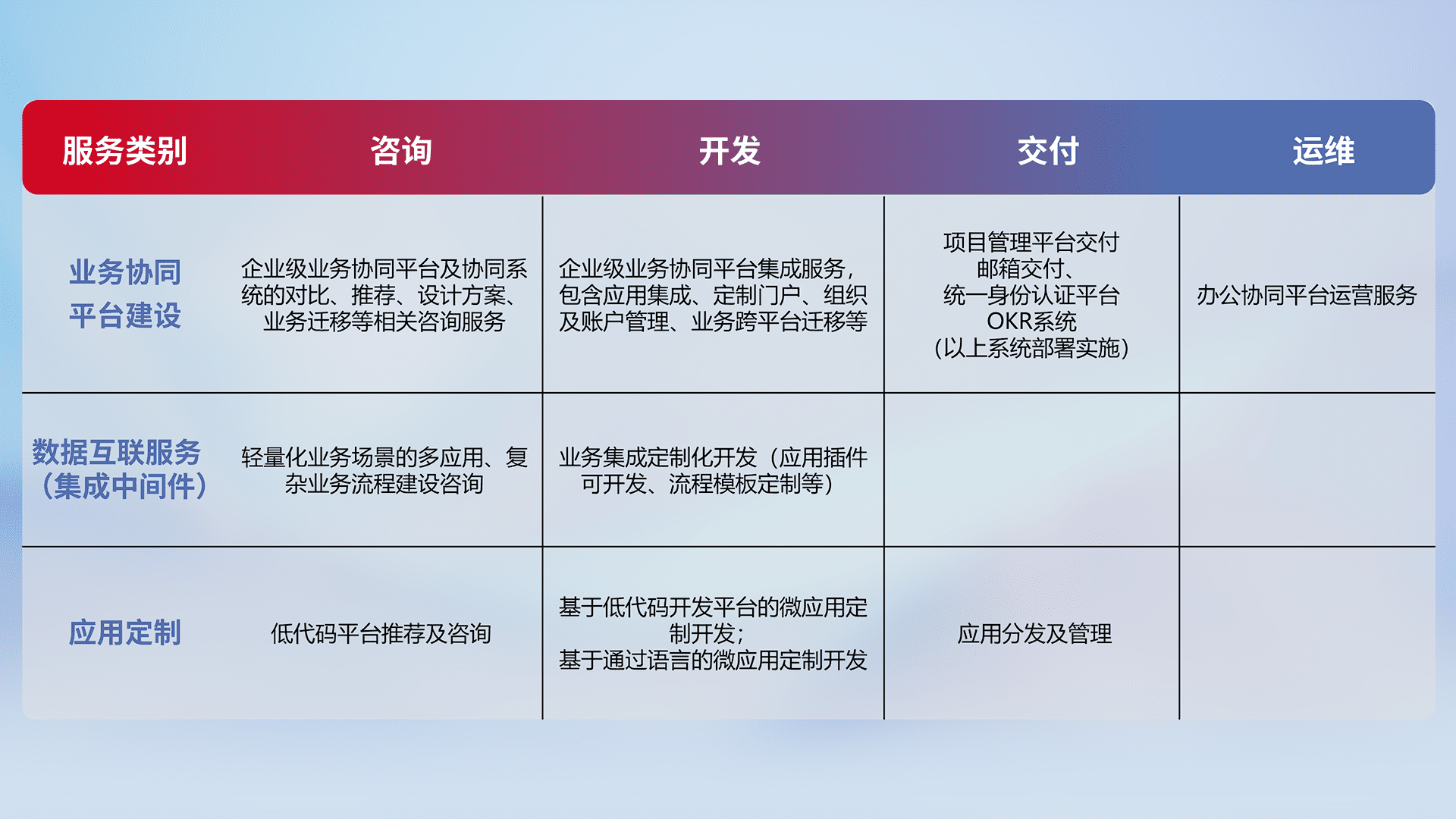 针对钉钉、、企微、、、IDaas等平台级产品提供产品的规划、、方案、、、、交付、、、定制化开发等服务,,实现如统一协同办公、、智能客户服务、、混合会议管理、、智能数据查询、、、等业务场景,,,实现数字化转型。。。。
